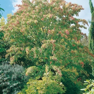 Piccolo albero molto decorativo con la corteccia verde grigio striata di bianco e il fogliame autunnale rosso e giallo.