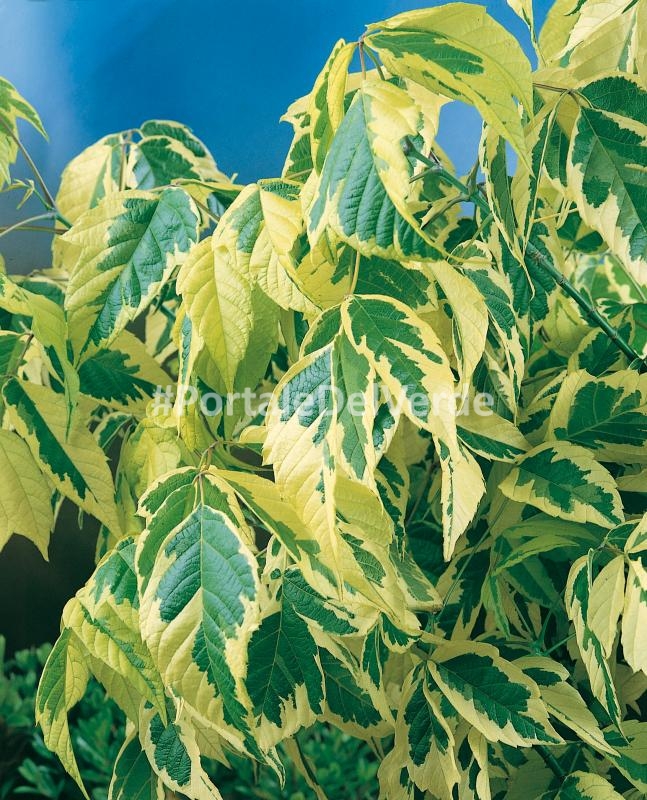 Acer Negundo 'Aureomariginatum' presenta le caratteristiche del 'Variegatum' ma con fogliame parzialmente marginato di giallo.
