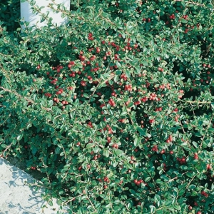 Arbusto molto rustico dal fogliame persistente verde scuro lucido, a piccole foglie ovali. Abbondante fioritura bianca in Maggio e Settembre, molto persistente durante l'inverno. Frutti globosi di 6-7 mm, color rosso corallo.
