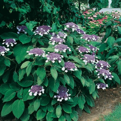 Quest' ortensia presenta, da Luglio a Ottobre, grandi panicoli di fiori fertili, da blu a porpora, circondati da fiori sterili bianchi, a volte sfumati di porpora.