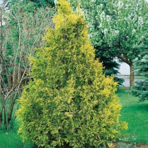Thuja Plicata 'Zebrina' (o 'Aureovariegata') è una conifera dalla forma conica allargata, a fogliame verde chiaro poco compatto e con giovani germogli giallo oro fino all'estate.