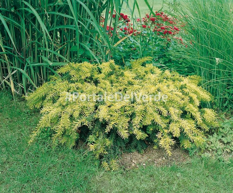 Taxus Baccata 'Repandens Aurea' è identico a Baccata 'Repandens', con fogliame giallo bronzo e giovani germogli giallo oro.