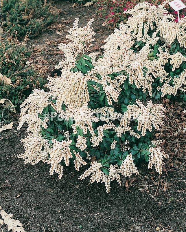 Pieris Japonica ‘White Pearl’ possiede piccole foglie, verde scuro. Arbusto compatto.