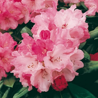 Rhododendron 'Belona' possiede fiori rosso carminio in boccioli, rosa aperti.