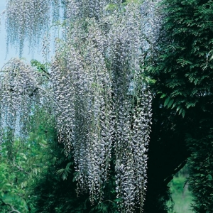 Wisteria Floribunda ‘Macrobotrys’ (Floribunda ‘Multijuga’) possiede una fioritura malva, profumata, nella seconda quindicina di Maggio, di una lunghezza eccezionale da 0,80 a 1,20 m.