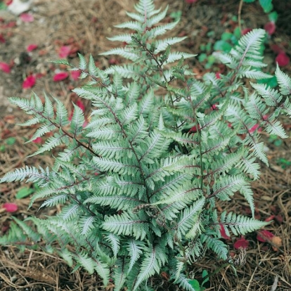Athyrium niponicum ‘Pictum’ è una felce strisciante.