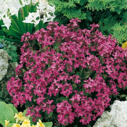 Possiede fiori carminio, profumati e disposti in corti grappoli, che sbocciano in Marzo-Aprile.