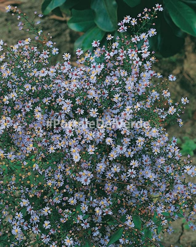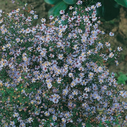 Gli steli ramificati portano una miriade di fiorellini blu violetto con cuore giallo, in Agosto-Settembre.
