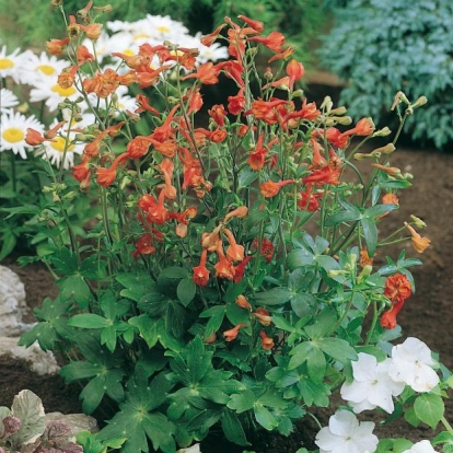 Fiori rosso aranciato, estremamente luminosi, prolungati da uno sperone orizzontale.