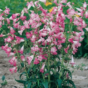 Penstemon 'Souvenir d'Adrien Régnier' sono piante Ibride cespugliose, fiori campanulati, rosa chiaro con gola bianca.