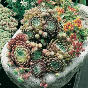 Sempervivum 'Hey Hey' è un Ibrido e possiede piccole rosette globulose, villose, verde grigiastro, colorate di rosa, soprattutto in primavera.