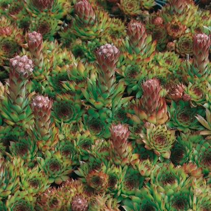 Sempervivum tectorum possiede foglie verdi, lucide, da bruno a bruno violetto alla sommità.